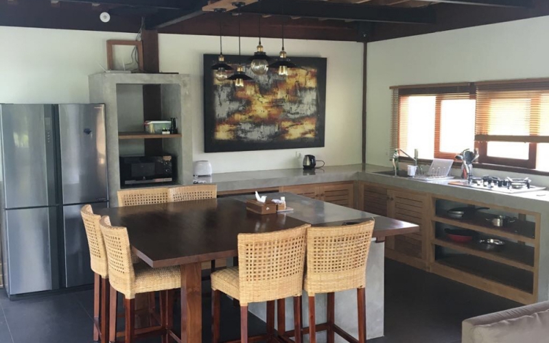 Ideal for both business travelers and families, the house comfortably accommodates up to 8 adults or a family with children. Spanning two levels, the layout includes a generous open-plan living area on the ground floor that seamlessly integrates a fully equipped kitchen, dining space, and lounge. This airy communal area extends to a spacious terrace that overlooks the garden and private swimming pool—offering the perfect setting for relaxation, entertaining, or simply enjoying the tropical surroundings.